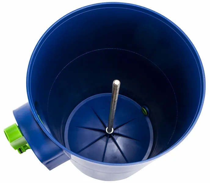 Als je de kraan nu aanzet zal er een krachtige straal op de filters worden gericht waardoor je filters perfect schoon worden gemaakt, zelfs in de naden. Door de schroefdraad van de geleider zal de filter langzaam omhoog gaan. De filter wordt zo totaal gereinigd. Het overtollige water stroomt via een kleine uitlaat aan de onderkant van de emmer weg. Je hoeft bij de Estelle DCS niet nog een vloeistof aan te brengen.